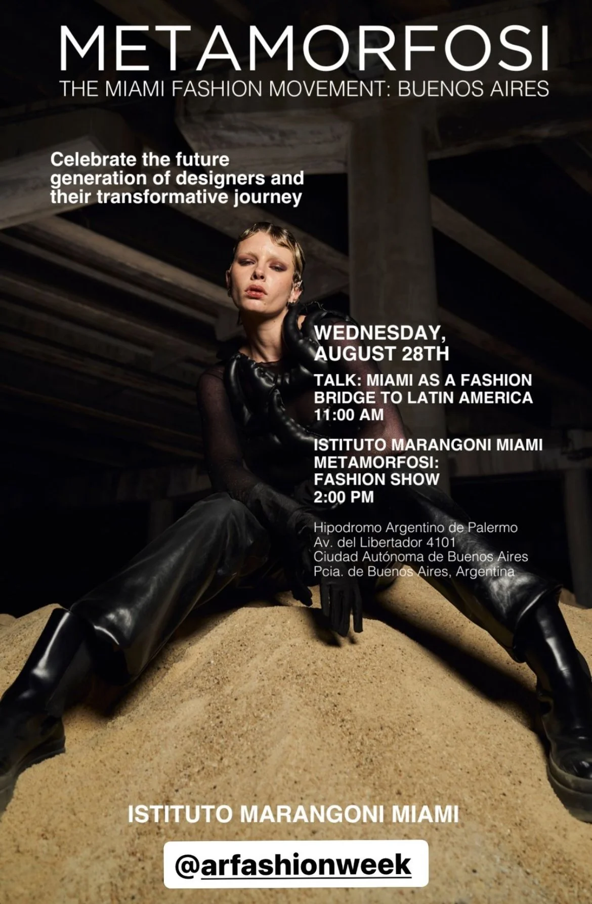 Istituto Marangoni Miami participated in Argentina Fashion Week 2024 at the Hipódromo de Palermo in Buenos Aires as part of their 'The Miami Fashion Movement Tour'. The event took place on August 28, 2024, and was called "Pasarela Emergente Amsoar".